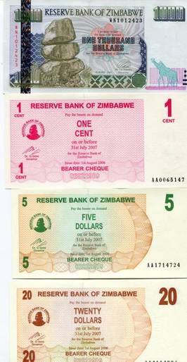AMAZING ZIMBABWE 2003-2009 INFLATION MEGA SET 36 NOTES 1 cent-10 Trillion UNC as shown in the scans covering the HYPER INFLATION PERIOD in ZIMBABWE starting with the 1 cent Bearer cheque up into the Millions and Billions back down to normal $100 German printed notes and back up to Billion Agro Cheques , down again into Million normal notes and then Skyrocketing into Billions and finally trillions in 2009 - A Must for any Collector showing what happens when you print too much money !